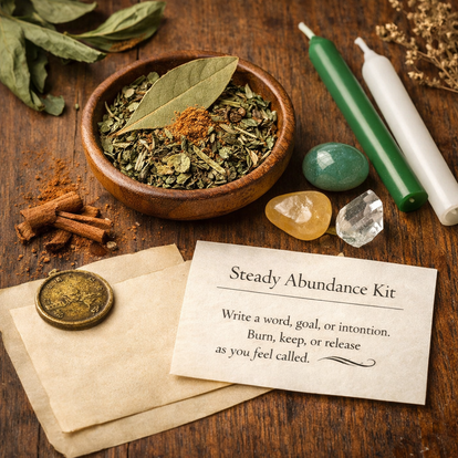 Each kit includes a curated blend of traditional prosperity herbs—cinnamon, bay leaves, basil, and clove—paired with salt and packaged in a reusable sachet. A green or white candle and one stone (milky quartz or green aventurine, selected intuitively) are included to support clarity, growth, and abundance.